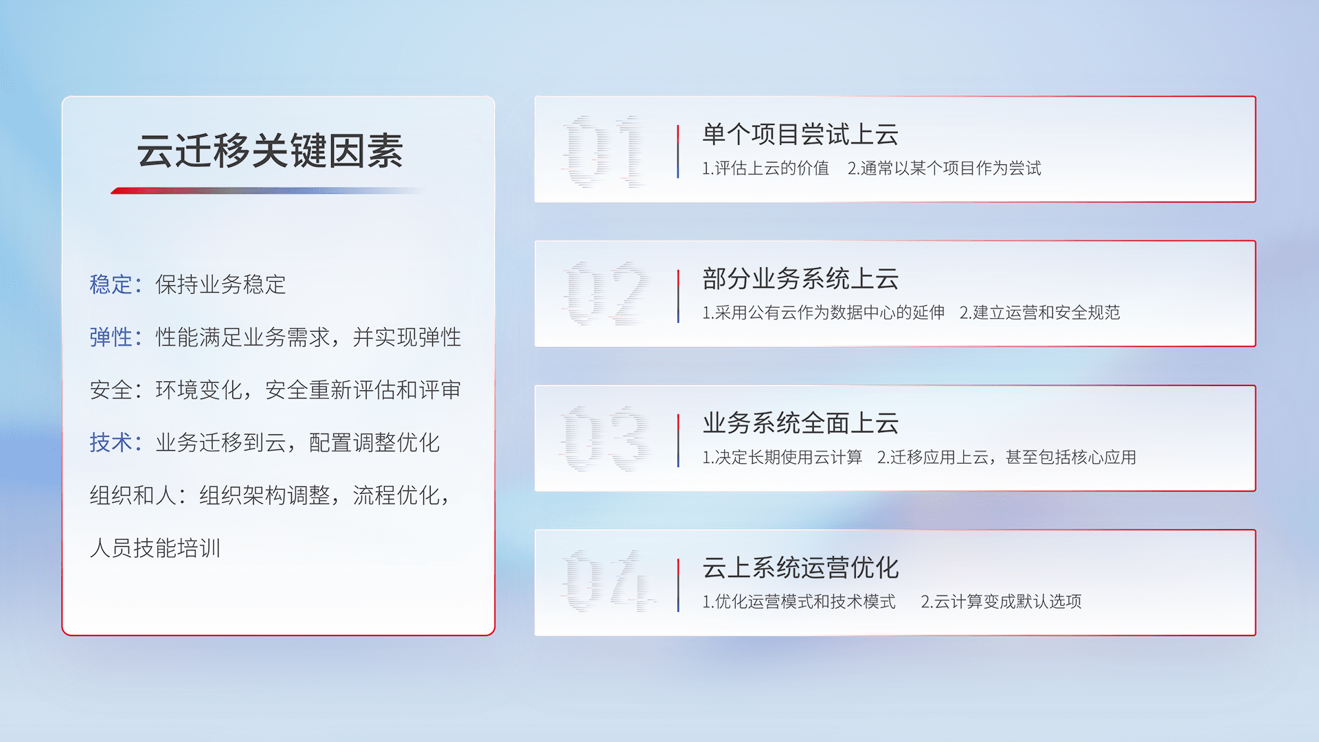 结合实际业务,,,,从规划设计、、、云平台选型、、云原生改造、、、、数据迁移、、集成交付,,迁移全过程为客户识别最佳上云路径,,,,做好风险识别管理,,设计网络架构、、身份权限、、、安全审计合规、、操作审计、、、、日志审计、、、监控告警策略、、、、多站点容灾设计等,,对云上基础设施进行整体规划,,,提升IT治理水平,,,,以满足弹性、、高可用、、高性能的需求。。