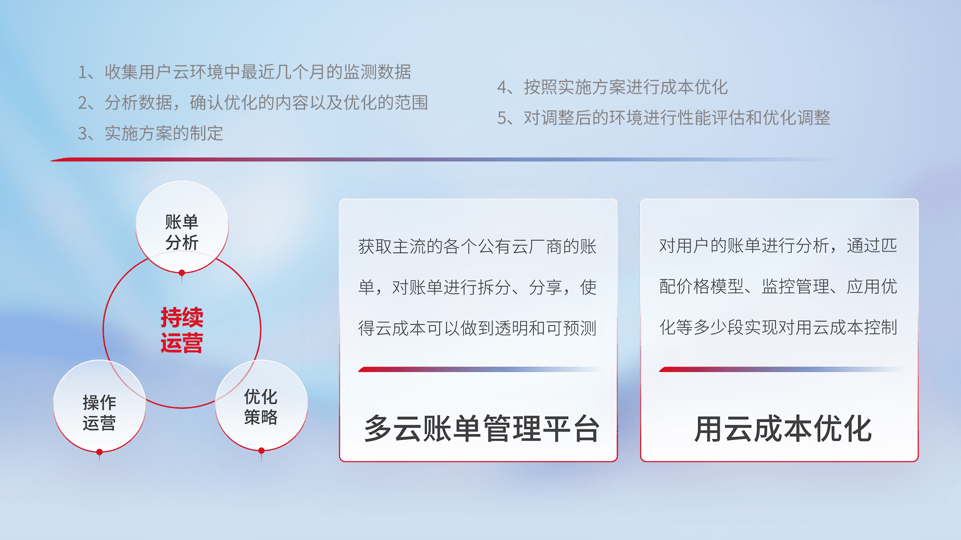 通过多云纳管,,以统一的资源数据模型把客户的云资源进行抽象和封装,,进而实现对多云资源的统一操作,,,保障云资源管理的可靠性、、、、稳定性与可用性。。。。量身定制化运维内容,,配置、、、开发运维、、、、补丁管理、、、备份、、、监控、、认证和访问管理、、、、审计和日常巡检等,,保障在用云过程中的可靠度,,稳定度以及高可用率。。