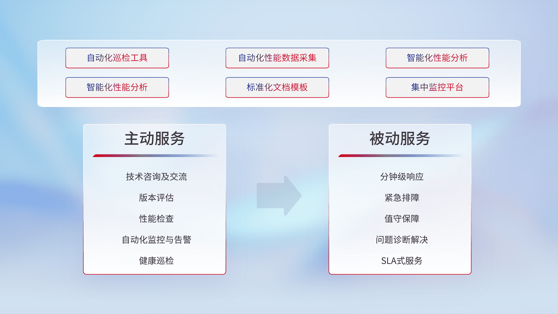 智能化工具和标准化文档,,,,保障服务质量,,提供主动服务(包含技术咨询、、、版本评估、、、、性能检查、、、自动化监控与告警、、、健康巡检)和被动服务包含(分钟级响应、、、、紧急排障、、、、值守保障、、问题诊断解决、、、SLA服务)。。。。
